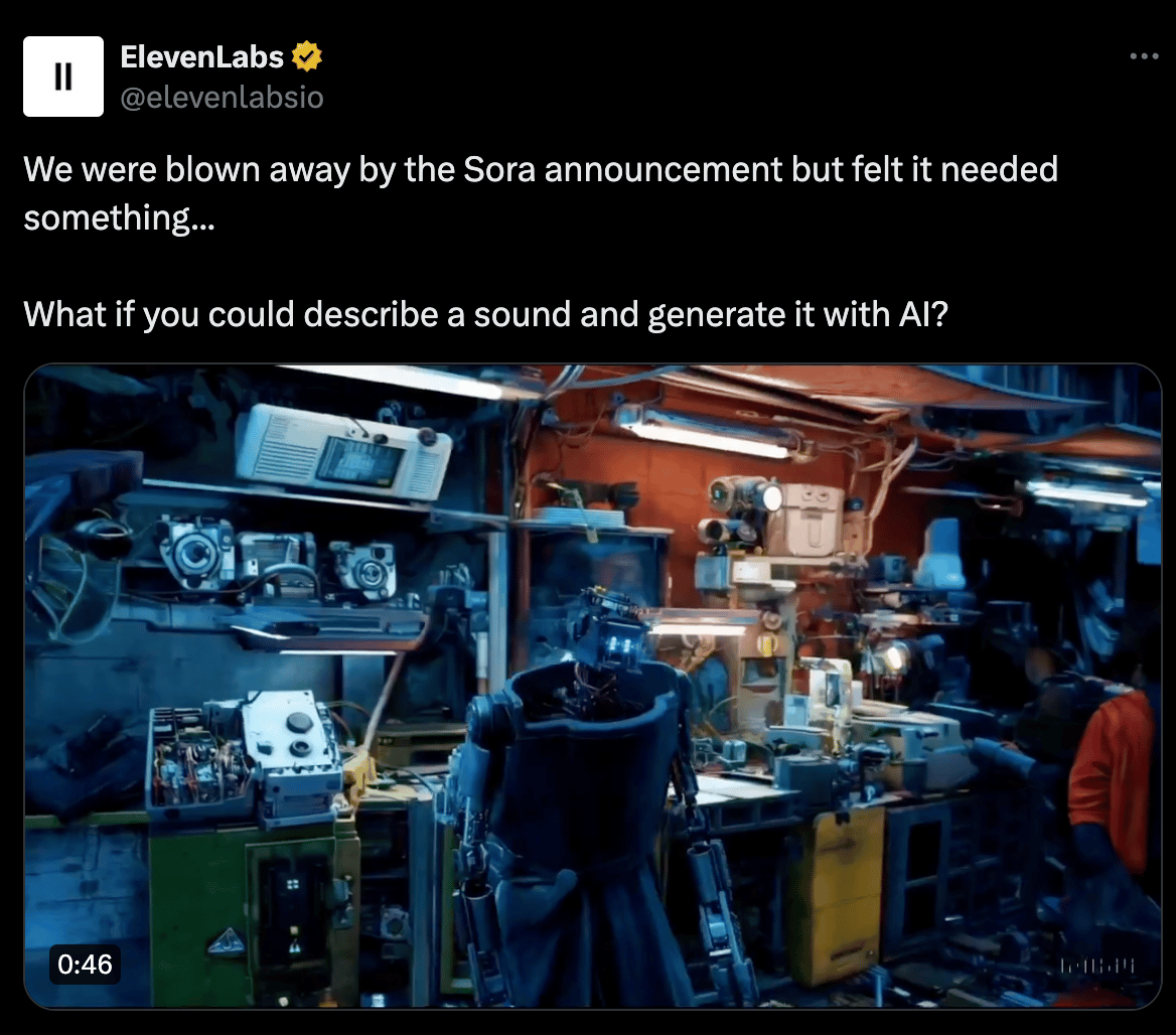 This is groundbreaking since in the next few months we’ll be able to use SORA for the video clips and Eleven Labs for the supporting sounds.
