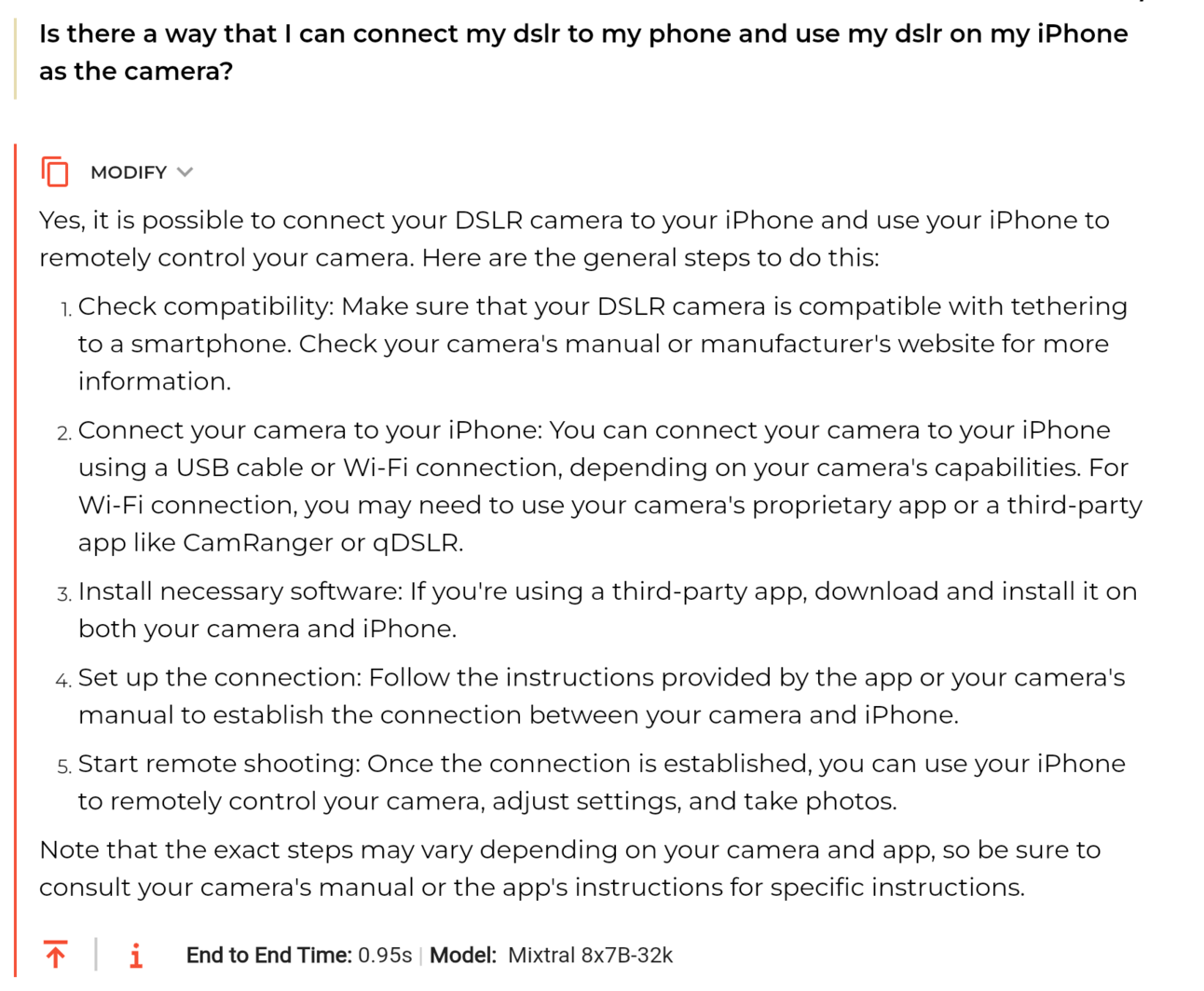 We wanted to see how fast it could answer a harder question. So we asked Is there a way that I could connect my DSLR to my phone and use my DSLR on my iPhone as the camera?