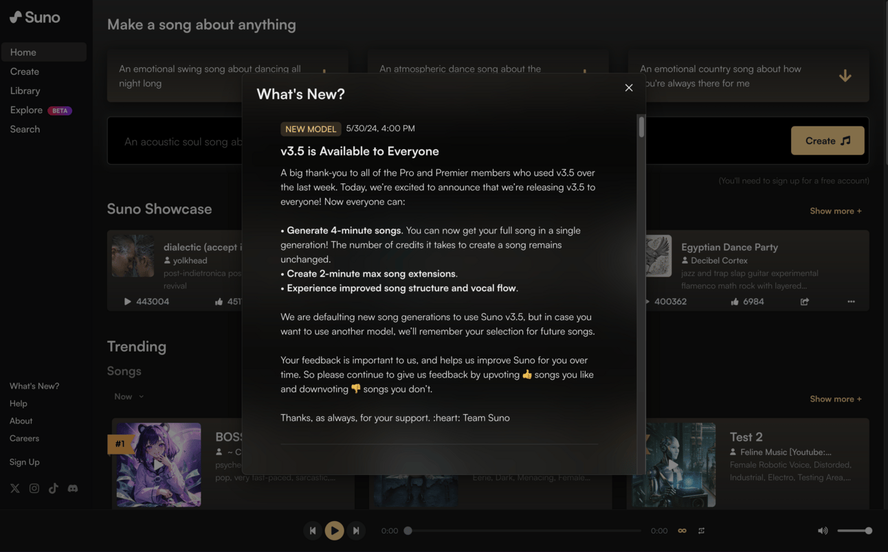 Suno has released an update to its music generation model. The latest model, 3.5, allows users to generate 4-minute songs; Meaning you can now get your full song in a single generation.