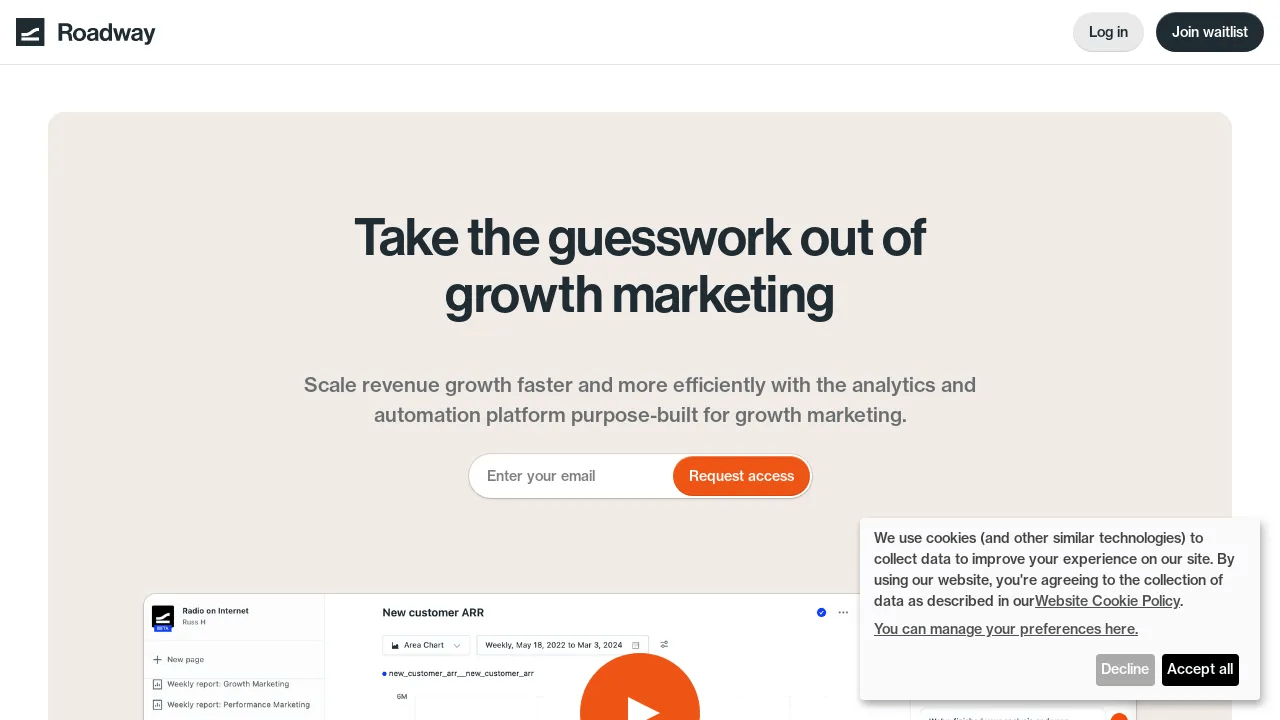 Roadway is a growth marketing platform designed to scale revenue growth efficiently and quickly. It offers personalized growth marketing copilot for analysis and insight automation, focusing on metrics and growth levers that matter to your business.