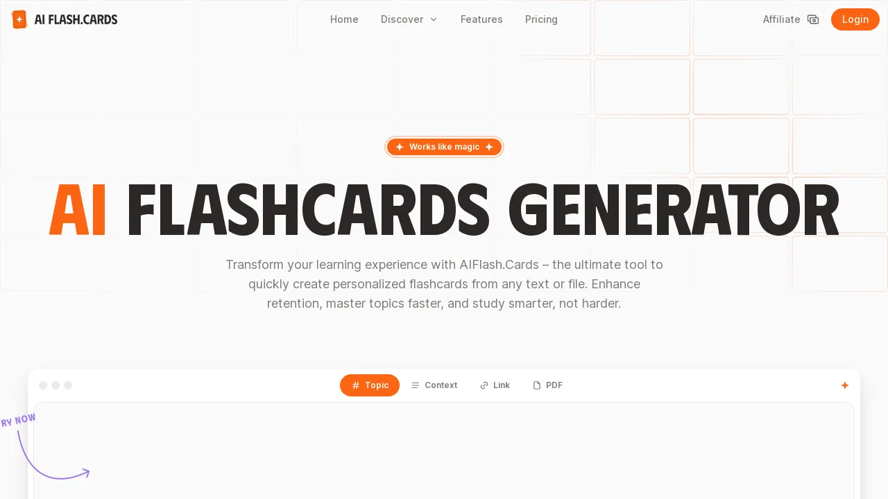 AIFlash.Cards is an innovative study tool that uses artificial intelligence to create personalized flashcards. It supports a variety of input methods, including topics, context, links, and PDF files, and can generate flashcards in 100 different languages.