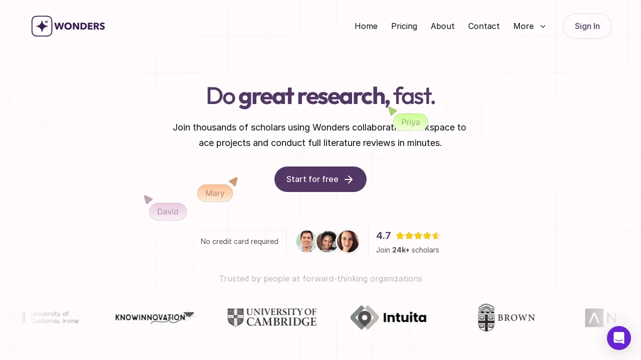 Wonders is a state-of-the-art research tool that combines search, organization, teamwork, and analysis into a single workspace. It is designed to help scholars and professionals conduct high-quality research quickly and efficiently.