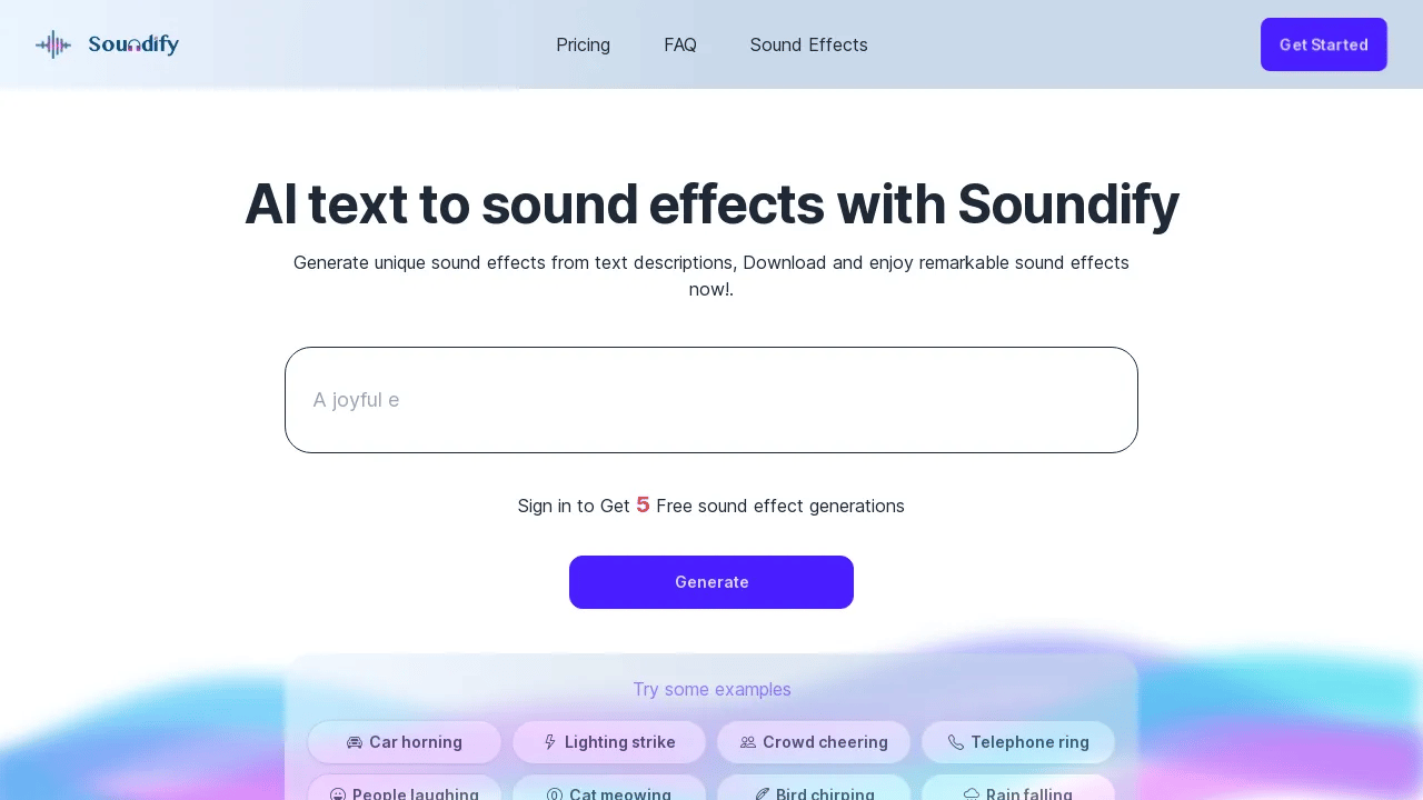 Soundify is an innovative AI-powered sound effect generator that enables users to create unique sound effects from text descriptions. It is a versatile tool that caters to a wide range of audio needs, from background music to ambient sounds and special effects.