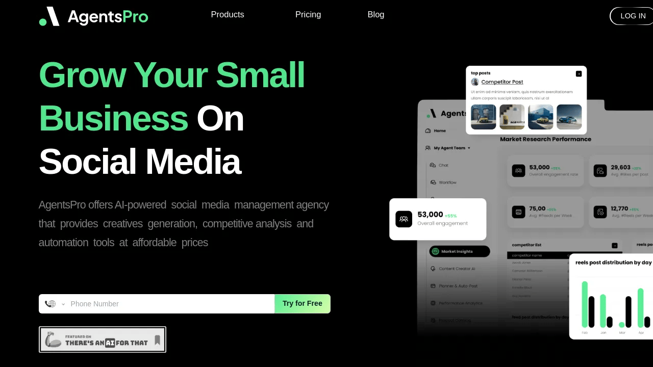 AgentsPro is an AI-powered social media management agency designed to help small businesses grow their online presence. The platform offers a range of features including creative generation, competitor analysis, content planning, scheduling and publishing, performance analysis, and a small business toolbox.