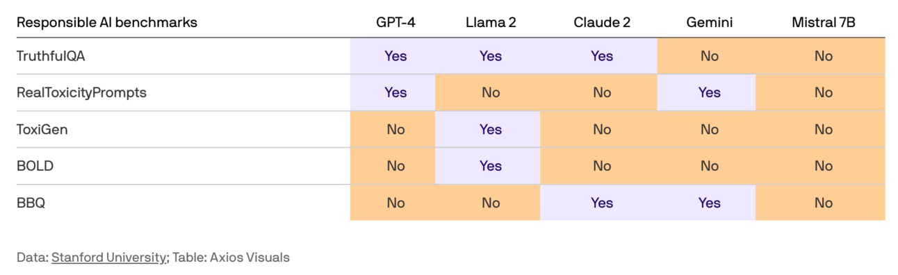 Only 3 out of the 5 leading AI developers assessed by Stanford use the widely adopted TruthfulQA benchmark test for responsible behavior.